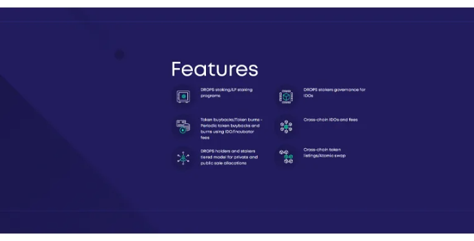 They provide various Drop staking/LP staking programs for their users. DeFiDrop provides its users with useful DROPS holders, and stakers tiered models for private and public sale allocations. They offer Periodic DeFiDrop token buybacks and burns using IDO/incubator fees.