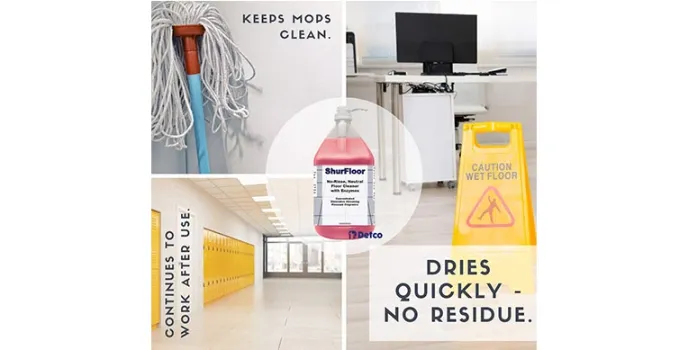 Here are various benefits that can be achieved with this floor cleaner. By using this floor cleaner, Detco ShurFloor can be used very efficiently on any hard surface floor because it is non-corrosive, non-caustic, and non-hazardous. The usage of this neutral solution helps in eliminating floor slickness, odors from drains, eliminate pests from food sources, ensures that there arenβt any foul odors from drains, etc. It works powerfully, dries faster, and makes the floor cleaner.