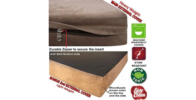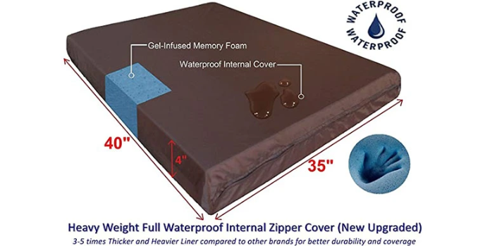 The Dogbed4less Pet Bed covers are available in 40X35X4 inches in size with a microfiber cover as well as 100% memory foam insert. It has a waterproof liner with two external covers. The covers are washable and very comfortable. It has a hypoallergenic high density with a 100% gel-infused temperature regulating memory foam pad that provides support that helps in relieving arthritis pain.