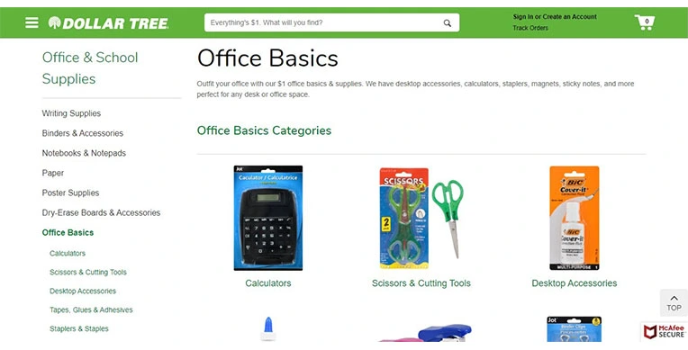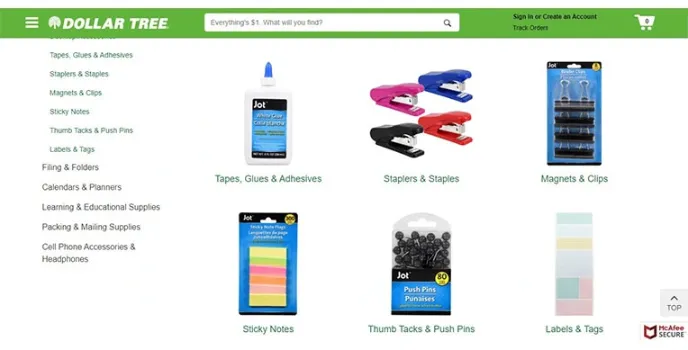 The Products available with Dollartree online stores to buy office supplies are categorized under the following labels Writing Supplies, Binders & Accessories, Notebooks & Notepads, Papers and Pamphlets, Poster, Dry-Erase Boards & Accessories, Filing & Folders, Calendars & Planners, and Learning & Educational Supplies.