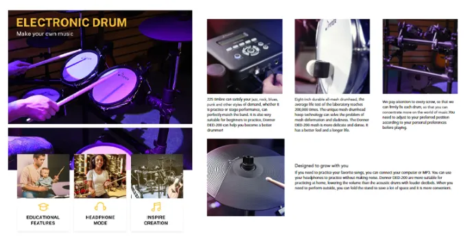 The Electronic Drum Sets for Beginners is an individual drum's acoustic drum sampling, continually checking and modifying timbre, making the sound more natural and outstanding, and shortening the reaction to shock to eliminate the sound delay. Users may practice it at home or in the band.