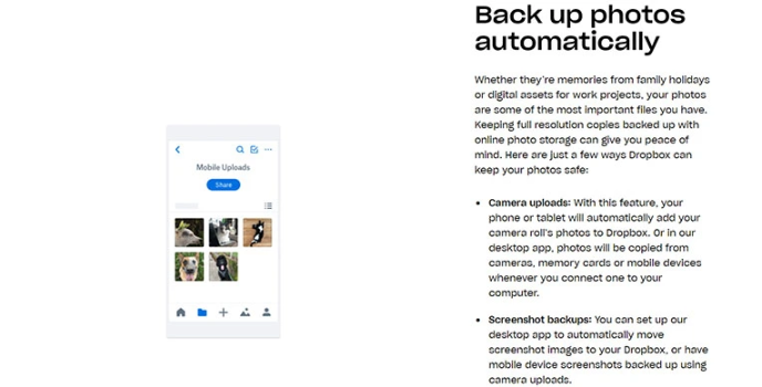 Unlike other online photo storage services, Dropbox sees that one can easily browse the images and videos that are backed up. It organizes all the photos in different folders. One can even create subfolders to prioritize the pictures further. It is designed to reduce the workload and collaborate with team members across other locations.