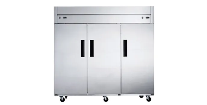 The freezerβs interior and exterior are backed up with brushed high-quality stainless steel material. It makes itself one of the best 3-door commercial freezers. The elegantly designed door with solid hinges is provided with a recessed handle for smooth access of open/close functionality. The self-closing feature supplies additional convenience.