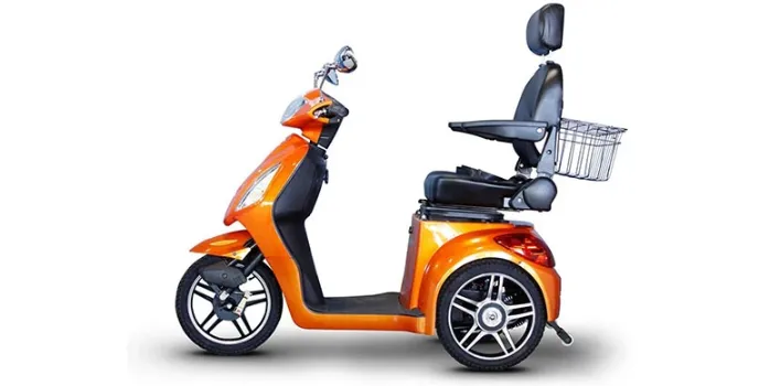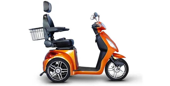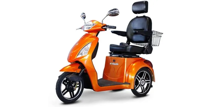 It comes in the color orange, and it uses a transaxle brushless electric motor. At full power, the EW-36 can reach speeds of up to 18mph, making it easily the fastest mobility scooter on the market. It has a 45-mile range on a single charge and includes a reverse switch, armrest, and a large storage basket.