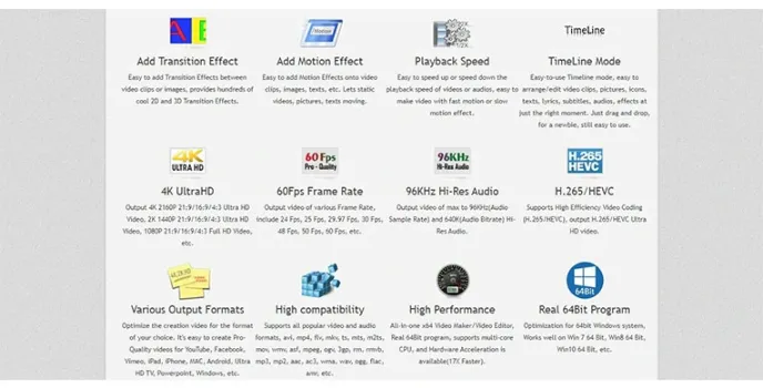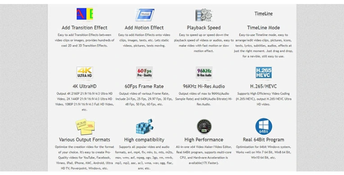 - Easy Video Maker authorizes the user to add several transition effects, motion effects, including playback speed, high compatibility, high performance, and timeline mode.
