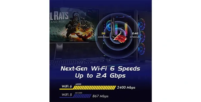 This network card has dual-band frequency modes, which allow the users to utilize upgraded wifi speeds up to 3000 Mbps. If the frequency is 5.8 GHz, then the speed can be up to 2400 Mbps, and if the frequency is 2.4 GHz, then the speed of the wifi is up to 600 Mbps.