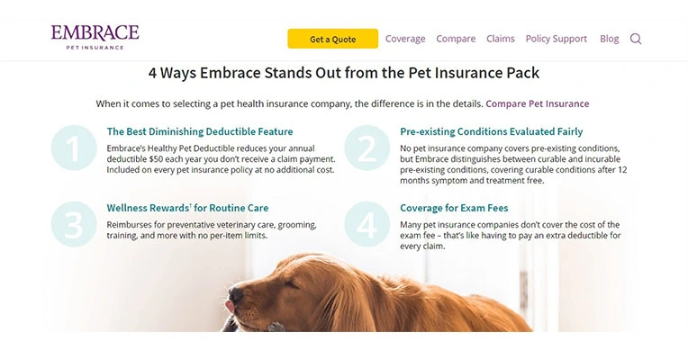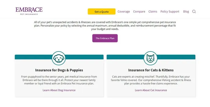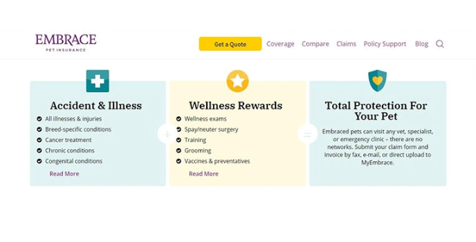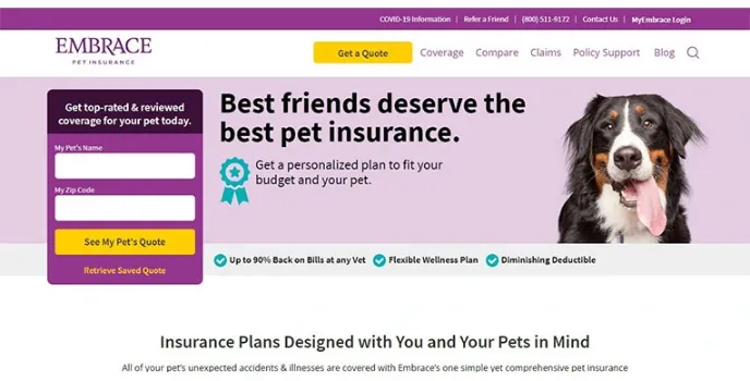 Embrace Pet Insurance is an insurance and warranty company providing medical cover for pets like dogs and cats. One of the company's best attributes is its insurance cover includes flexible wellness plans, preventable conditions, behavioral care, and even a 24-hour pet health line that more other brands do not offer.
