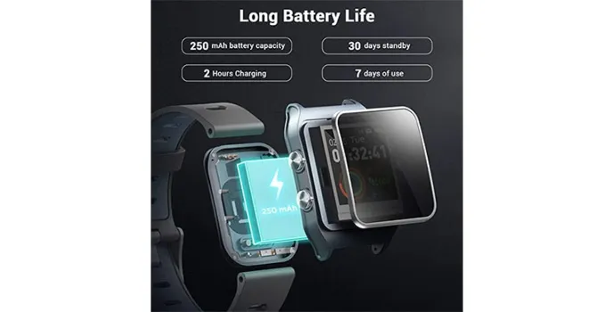 These watches are certified waterproof smartwatches that are perfect for sports enthusiasts. These watches are built with a 250 mAh lithium battery availing a long battery life for your smartwatches. The watch can last for 168 hours in regular smartwatch mode on a single charge.