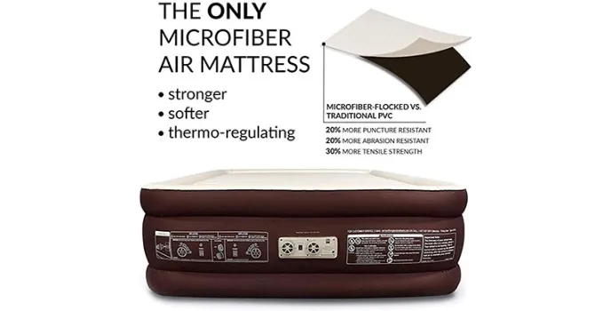This airbed mattress from Englander comes with a built-in pump and a full microfiber exterior. It makes for a strong and durable surface for the best, but inside, it is an air mattress that is 20 percent more puncture-resistant, 20 percent more abrasion resistant, and comes with added 30 percent of tensile strength.