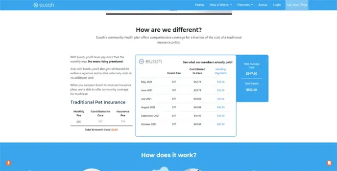 The monthly cost of animal health insurance and expenses is shared in the community to cover hidden fees directly to pet care. The great customer service is fast, easy, and good experience about medications, Labs, and procedures.