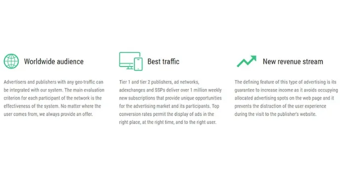 The tool knows how to sell your traffic quite well and is compatible with all GEOs, devices, OS, and browsers. It helps connect you to thousands of advertisers ready for bidding for your traffic with reasonable optimization.