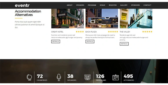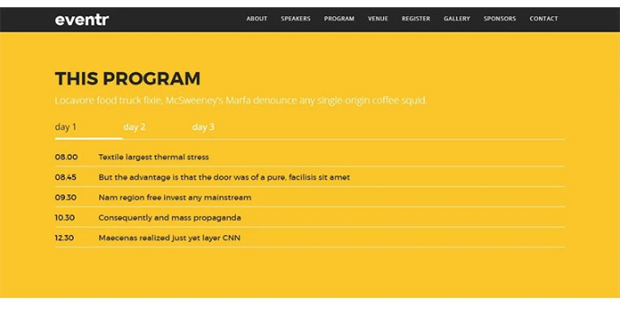 Eventr is a retina-ready event website template that facilitates easy registration and subscription options. Besides, it offers website templates with cross-browser support. It includes HTML and CSS files. Furthermore, you will get templates built with the bootstrap 3 frameworks. The template is font icons ready and ensures your webpage is clean yet navigation friendly.
