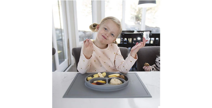 It is considered the pioneer among the suction mats that most parents became convinced with its design. This kid’s food plate is made with 100% silicon and has three compartments where you can place fruits, vegetables, and dry fruits.