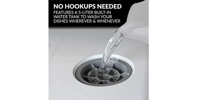 This portable countertop dishwasher from Farberware is ideal for washing and sanitizing containers and feeding babies with the wash cycle feature of baby care. It is the most suitable washer for smaller spaces like dorms, small-size apartments, boats, and campers. A built-in water tank can fit up to 5 liters of water without any need for a hookup.