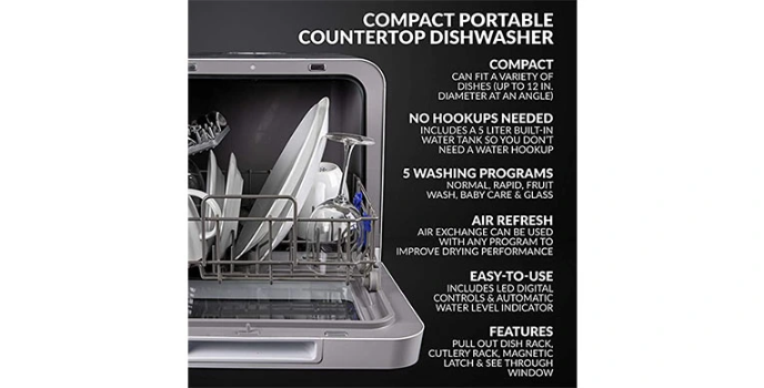 This portable countertop dishwasher from Farberware is ideal for washing and sanitizing containers and feeding babies with the wash cycle feature of baby care. It is the most suitable washer for smaller spaces like dorms, small-size apartments, boats, and campers. A built-in water tank can fit up to 5 liters of water without any need for a hookup.