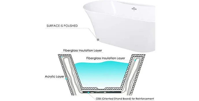 FerdY bathtub is a cost-effective bathroom appliance that can facilitate the bath requirements of a small family under a minimum budget. This bathtub design is beautiful and minimalistic, shaped like an oval, and made of acrylic solid surface material with a glossy finish. There are handcrafted curvatures and details that make this tub a suitable fit for modern and authentic decor homes and hotels. The polished material of this tub makes it easier to clean. It has a length of 67 inches and a depth of 15 inches, which is sufficient for an average man to lay down and enjoy its perks.