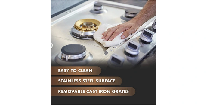 The stainless steel cooktop comes with edge-to-edge heavy cast-iron gates that come with support attachments to make for easy pots and pans movement. It is compatible with pots and pans of all sizes.