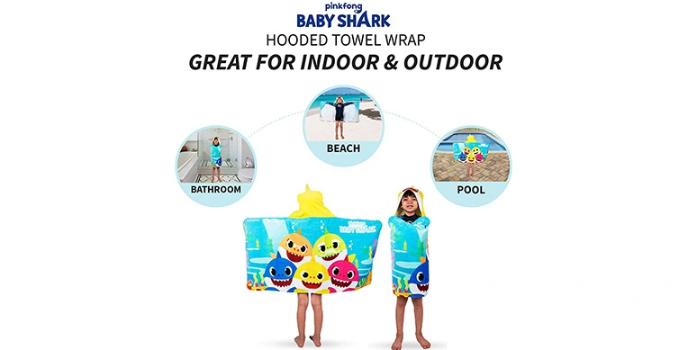 The Baby Shark is here in full force with its family in this cuddly yet soft hooded towel. With the help of the Shark family from the famous kids' song by Pingfong, wrap your kid in warmth as well as cosy style. Such towels are easy to find in lifestyle stores as well.