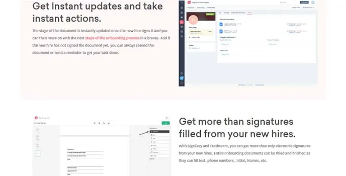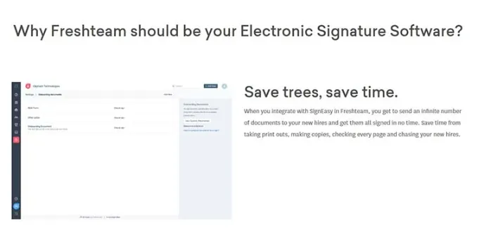 FreshWorks, one of the best electronic signature software, has intelligent team management solutions and applications tracking integrated systems with ATS. Its algorithms read the input via code and allow the user to put it in the form of a signature in any electronic copies. The security authorization is responsible for maintaining a discrete environment for the templates and documents, eliminating any chances of physical discrepancies.