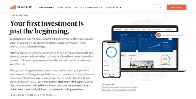 Fund Rise is a great platform offering potential earnings on your investments. It also makes for investing in real estate projects and helps create tax-efficient IRA accounts like Acorns and M1 Finance for retirement. The natures of the portfolios are quite dynamic and are made to ensure the complete growth of individuals.