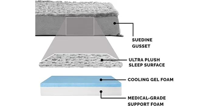 The cooling pet bed comes in an open mattress design that gives tons of space to sleep in different positions, and the sides provide height and high-loft support for enhanced and better lounging comfort. This deluxe pet bed's sleep surface made with ultra-plush faux fur is exceptionally soft to touch and snuggles the pets in extreme cozy and comforting. It includes a gel-infused memory foam, which aligns the pet's body to provide excellent orthopedic support and eases the overall discomfort to allow for better sleep, similar to the Furhaven Pet Bed. It is available in small, medium, large, jumbo, and jumbo plus sizes.
