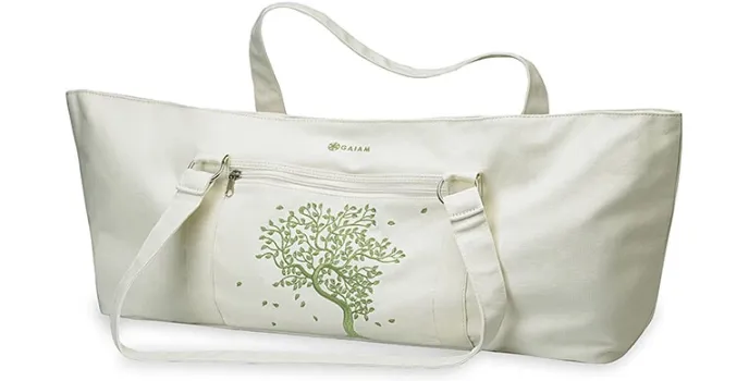 Most of the best yoga mat bags are sling and go across your body, but this model works as a traditional tote bag sized to fit your entire mat inside. It has an outstanding design zippered outside pocket and multiple pockets insides. This bag helps keep the inside protected and if you have the bigger size mat, then go for this product.