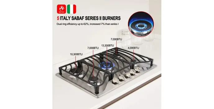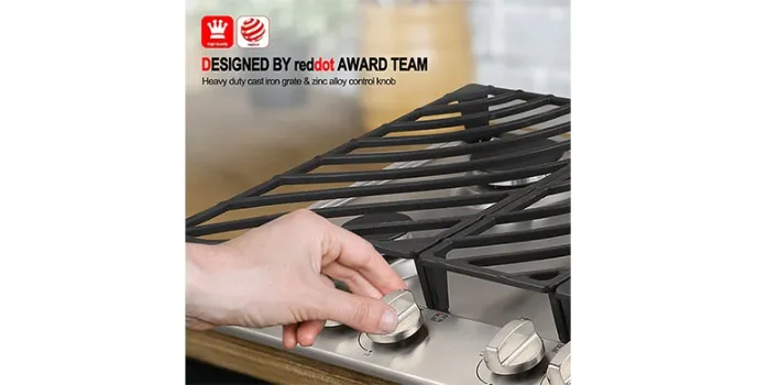 The stainless steel cooktop comes with durable zinc alloy knobs and cast-iron gates that make for effortless cleaning and maintenance.