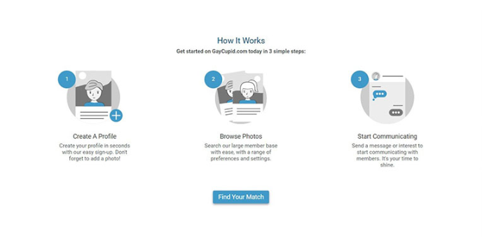 The Gay Cupid website helps to create your profile within seconds and provides easy sign-up features. You have to create a profile first and then browse through photos by searching the large member base with tons of ease and comfort. It comes with a vast range of preferences and settings. Once you have browsed through different individuals' photos, you can send a message or interest to start communicating with members.