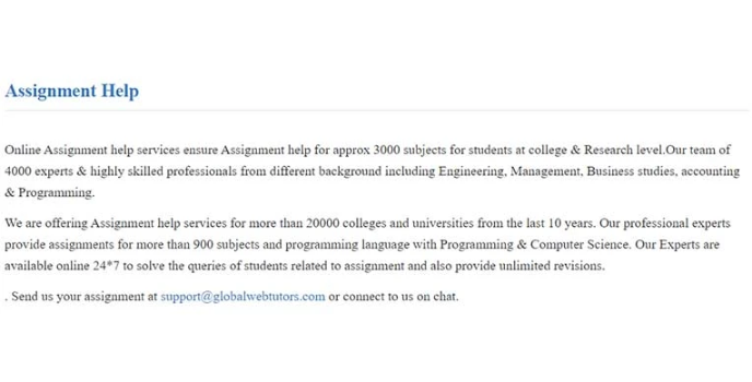 The company's online tutoring services are given to students at college and research level with around 3000 subjects. It has a team of 4000 highly skilled professionals and experts from diverse backgrounds like Engineering, Business Studies, Management, Programming, and Accounting. It offers assignment help services to over 20000 colleges and universities from a decade ago.