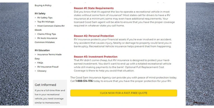All in all, for even most discerning clients, Good Sam provides robust plans and services as well as a good selection discount that is sure to hit the mark. This agency also provides roadside assistance and automobile, boat, motorcycle, and home insurance plans from leading insurance firms such as Progressive, Statefarm, and Safeco. At the same time, their primary line of business is recreational vehicle insurance.