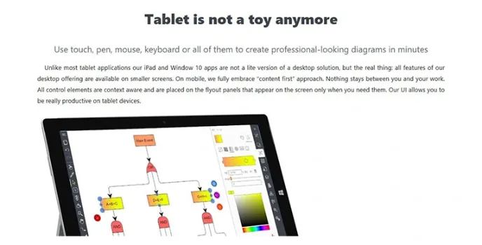 Grapholite is a fantastic software for desktop Windows 10 tablets and iPad. It is easy to use, a touch-friendly, affordable and powerful alternative to Cacoo. It is perfect for diagrams, charts, mind maps, layouts, floor planning website structures, and wireframes.