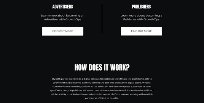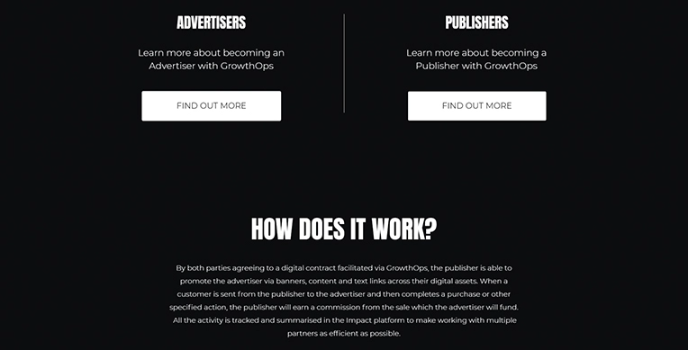 GrowthOps offers digital retailers the opportunity to grow their online sales and digital publishers to grow their advertising revenues. The types of affiliate network platform is used to power and track what they do, and the service is based on knowledge accumulated from the affiliate industry.