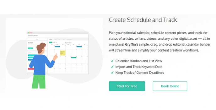 Create a schedule and track with Gryffin. It is the SEO project management software that helps in planning editorial calendars, tracking the status of articles, and scheduling content pieces. It further helps in simplifying and streamlining the content creation workflows.