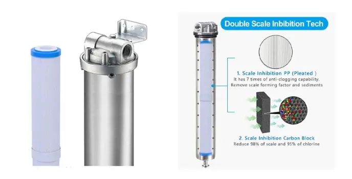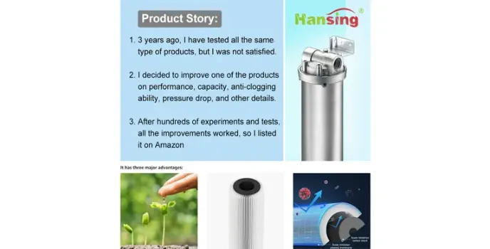 Using a 0.2-micron pleated filter and a radial flow design, the filtering area was increased to square inches, and tests indicate that it has seven times better anti-clogging performance. The pressure drop and clogging issues are eliminated with this design. Compared to an electronic descaler, Hansing whole house water softener reduces scale buildup and removes the harmful substances in scale.