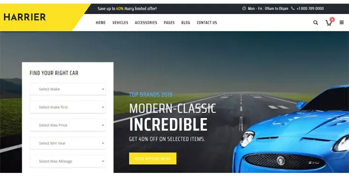 Harrier is a WordPress theme car dealer who makes automotive stores capable of easily advertising and selling different cars. This website prototype offers automotive dealer comfort to prospective clients on the internet in terms of car listings. This auto WP theme provides an advanced search car filter type to make locating a particular vehicle fast. Visitors may also send their trucks to sell them through the WordPress car dealer theme.