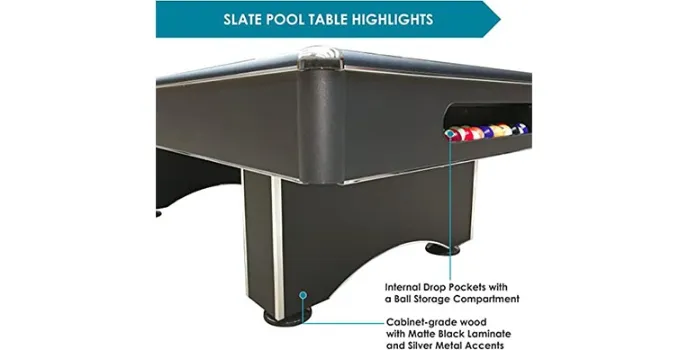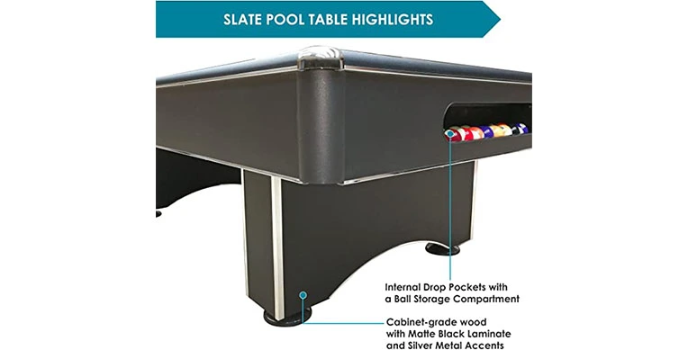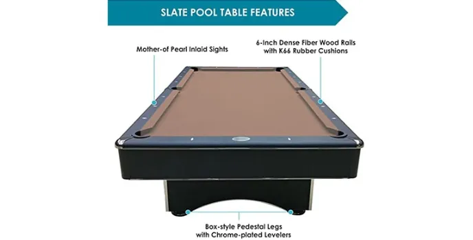 Harvil foot slate pool Table suits perfectly for the sports community. It comes with 6-inch dense fibre wood rails with an inlaid of pearl sights. You will get standard k66 rubber cushions. White, there are many table tools available. Harvil Pool Table provides premium quality and modern design billiard table for your sports needs. Besides, you will get features completed playing accessories and constructed with cabinet grade wood.