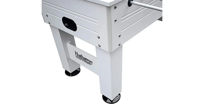 This dazzling blue play area suits well with a glittering white cabinet, producing a bright appearance that delights the eyes and enhances the action. Besides, the Highlander comes with built-in leg levels and a cross-supporting surface to ensure a consistent play level. It contains high-quality, weatherproof abs foosballs with 2-36mm nylon covers.
