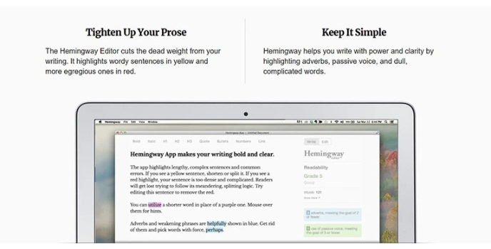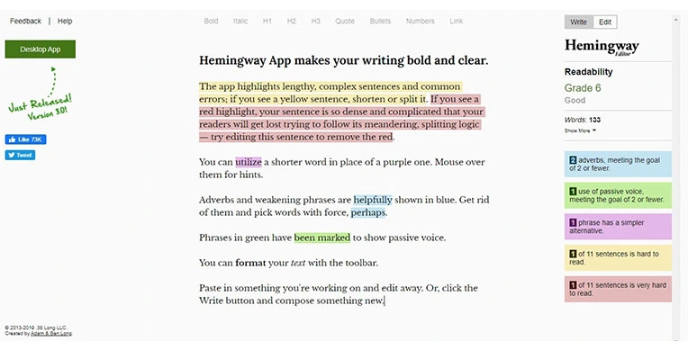 The Hemingway App is a great writing tool that highlights lengthy and complicated sentences and common errors and improves text styles and formats.