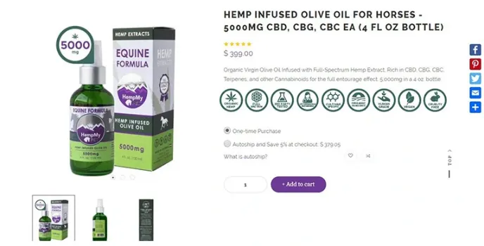 HempMy pet products online contain olive oil duly infused with full-spectrum CBD hemp derivative. The products are veterinarian recommended and are rich in their content of CBC, CBG, terpenes, CBD, and various other cannabinoids. Adding HempMy pet CBD products to the diets of your horse, dog, or cat will help in safeguarding the pet's health and boost its immune system. The serving size might vary according to the weight of a horse. Offering 40 mg of HempMy pet product for an average-sized horse would be sufficient to get the right and desirable results. Getting online at the HempMy Pet store will give you the chance of availing the HempMy Pet coupon that can further help you get some huge offers. So make the right move now and get something healthy for your pet! Other Products which offers similar features of HempMypet are Receptra Naturals and Roxy Pets.