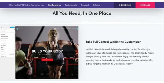 Hestia is integrated with orbit fox plugins. The customizing options of the tool is also powerful and helps in the agile accomplishment of the website designing. It takes full control within the customizer. The tool can provide the users with all that they need with just one platform. This feature is much loved by the users. It is also a one page theme for wordpress. One-page websites have become the latest trend.