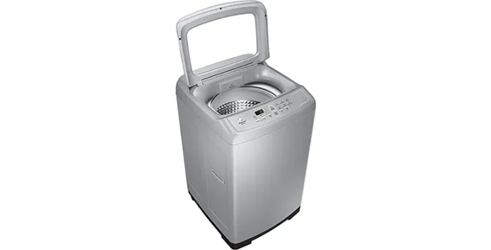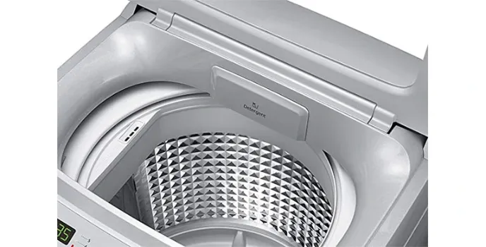 The design of this machine is attractive with silverish grey walls and top lid on the exterior and the interior is a stainless steel drum which has a long-lasting durability and is resistant to rust. The drum has the capacity to hold up to a weight of 6.2 kg of clothes. The control panel on the outside right on the top of the lid has a red LED light display to facilitate users to operate the washer even at night with ease.