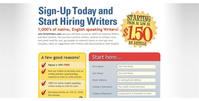 The Hire Writer Freelance site offers high-quality writers for business services and lets you hire experienced quality writers to fill in your website's content. It offers free membership, and the buyers or employers only pay for it when they are completely satisfied with the work. To ensure best quality work is delivered all the time, it pre screens thousands of writers.
