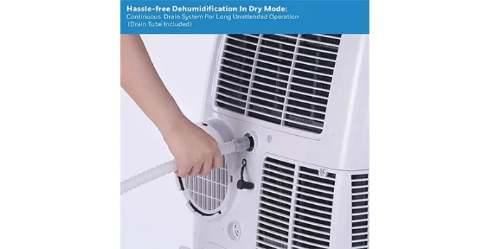 They are best fits for rooms of up to 700Sq.ft. They have a cooling range of up to 700Sq.ft and a heating range of up to 500Sq.ft. It uses an auto evaporation system, and the fan-only mode gently circulates air in the absence of cooling. They also provide a remote control for ease of use.