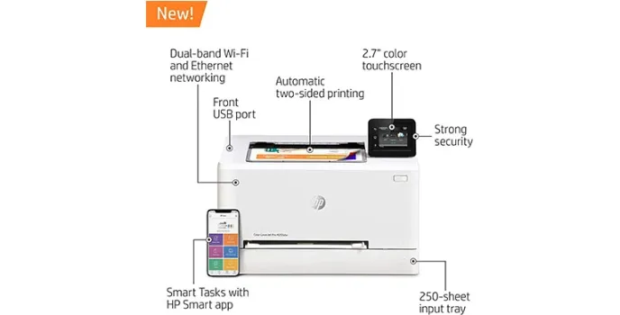 HP M255dw Color LaserJet Pro Wireless Laser Printer is here to impress with colour and increased efficiency. It is this best colour laser printer that provides for extraordinary wireless printing which is really fast printing with speeds up to 22ppm. HP colour laserjet pro printer comes with automatic two-sided printing along with an intuitive 2.7” colour touchscreen. HP wireless laser printers help you print with the HP Smart App and you can save time with customizable shortcuts. Works as this Wi-Fi laser printer that helps eliminate steps in repetitive tasks and organize documents 50% faster than too directly from the mobile device using exclusive HP office features in the HP Smart App.