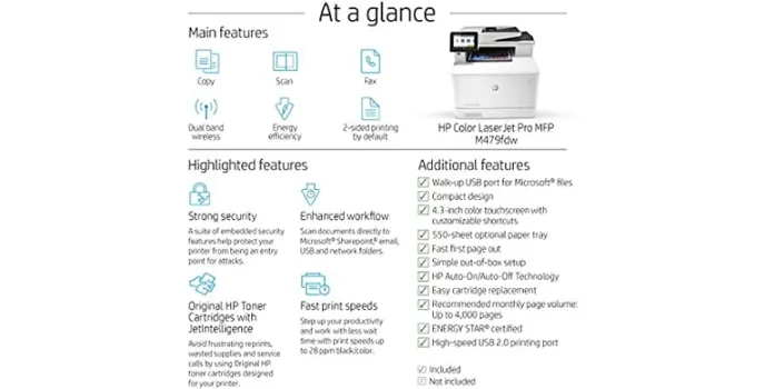 Using an energy-efficient pro printer has customized a 4.3-inch color touchscreen with shortcuts integration that the machine seamlessly operates. The scanner offers 300 input paper capacity with 28 pages per minute for both black and color print. Moreover, it delivers 750 to 4000 volume pages per month for small businesses.