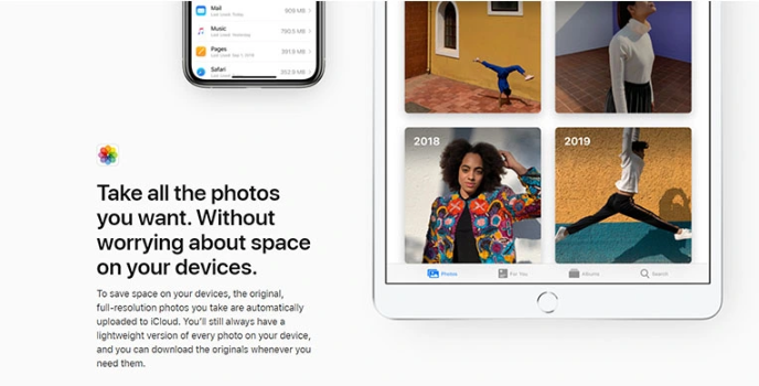 With iCloud Photos, online photo storage, one can have all their pictures and videos in one place. It will only transfer the high-resolution version and keep the light one on their device. One can download the original version from iCloud whenever one wants.