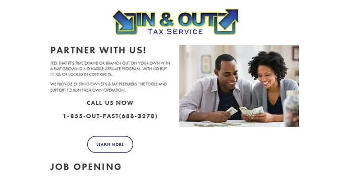 In and Out Tax Service is a tax-filing platform that helps take care of your business services and safeguards all your information throughout. It aims to provide high-quality products at great, reasonable prices and provide exceptional customer service that aims to deliver the best solution and experience levels for its customers and users.