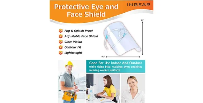 Ingear face shield is the transparent face cover that is here to get you complete face protection to put it precisely. It is the best clear face shield that gets you 180-degree protection from any unwanted droplets or saliva. This face shield with headband comes with a transparent face cover and has been made with acrylic and PET materials that are durable as per the face shield testing standards. This face protector mask is this clear plastic face shield that comes with acrylic glasses that fit over most eyeglasses and as per the face shield reviews, it fits comfortably.