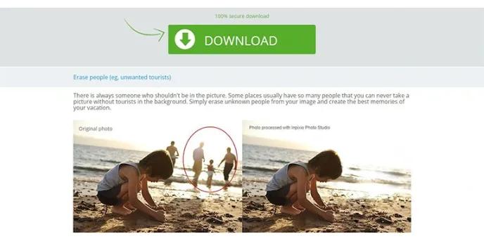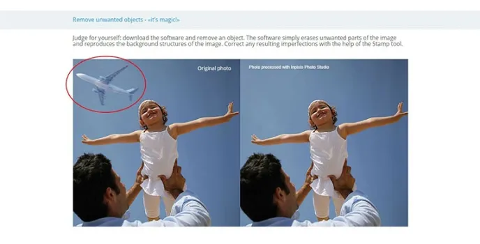 Inpixio photo editing software deletes selected parts and also restores background based on users' requirements. And you can correct any stains with the duplication stamp tool. It reduces the appearance of wrinkles and eliminates small stains too.
