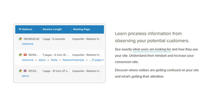 Inspectlet is one of the best conversion optimization and analytics software with seriously powerful filtering that helps in finding what the visitors are interested in watching. The conversion funnel also shows where and why people are dropping off. It helps in tracking down where potential conversions are being lost and then drives conversions up.